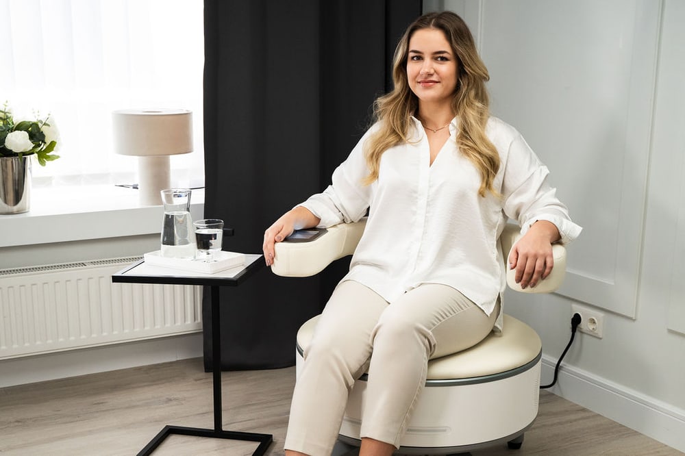 Sie sitzen entspannt auf einem Beckenbodenstuhl vollständig bekleidet und lächelnd, in moderner Praxisumgebung. In nur 15 bis 22 Minuten pro Einheit effektives Training mit bis zu 25.000 Kontraktionen werden Sie nach wenigen Sitzungen spürbare Ergebnisse merken.